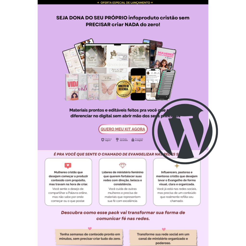 Para quem quer uma estrutura ainda mais completa e profissional Uma página totalmente personalizada para WordPress, criada para converter. Basta instalar, editar poucos detalhes e publicar. Você economiza semanas de trabalho técnico e começa sua jornada com estrutura de gente grande.